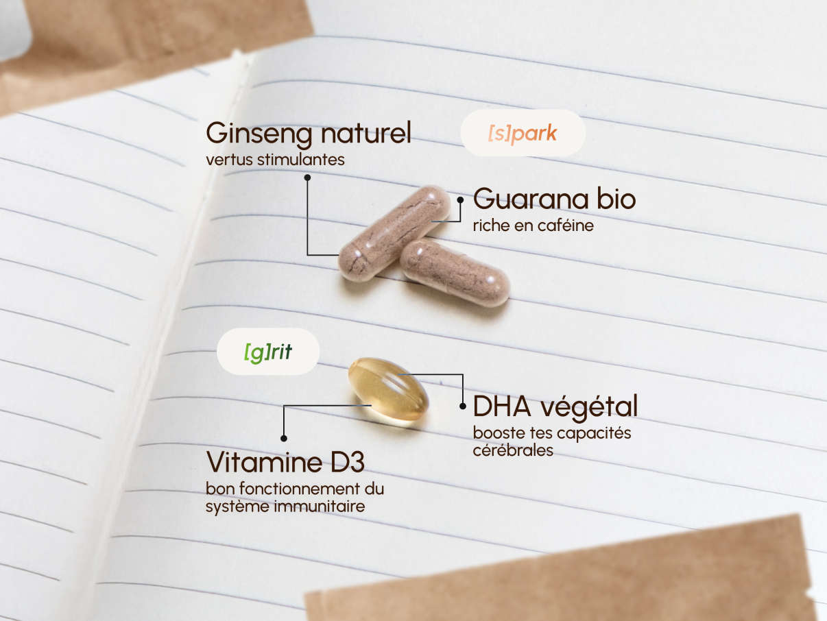 [g]rit t’aide à retrouver une vraie clarté mentale, le DHA végétal soutient tes fonctions cognitives et t’aide à rester concentré, surtout aux moments où tu as tendance à te disperser.